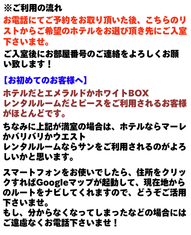 | ホテル名 | 住所 | 電話番号 | |